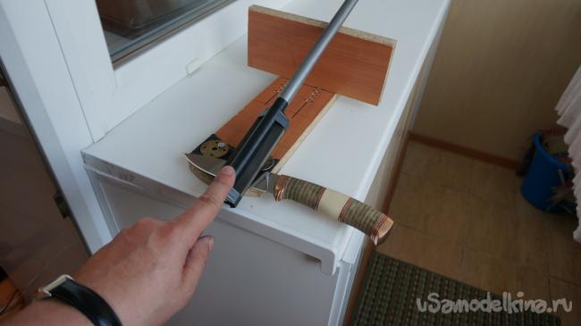 Пришлось конструировать приспособление для формирования и заточки режущей кромки с принципиально другим устройством жесткой фиксации ножа.
