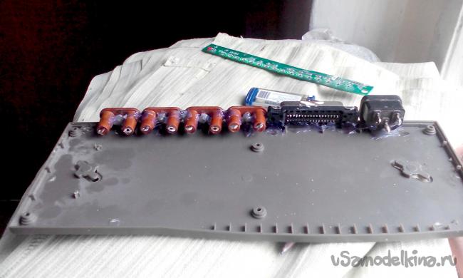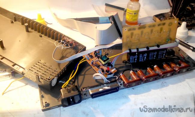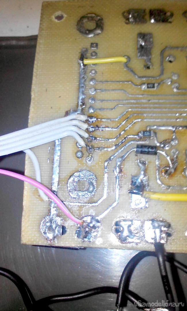 Возвращаемся к нашей плате и припаиваем к ней навесным способом управляющие провода которые в свою очередь подпаиваем и к приклеенному к корпусу LPTпорту.