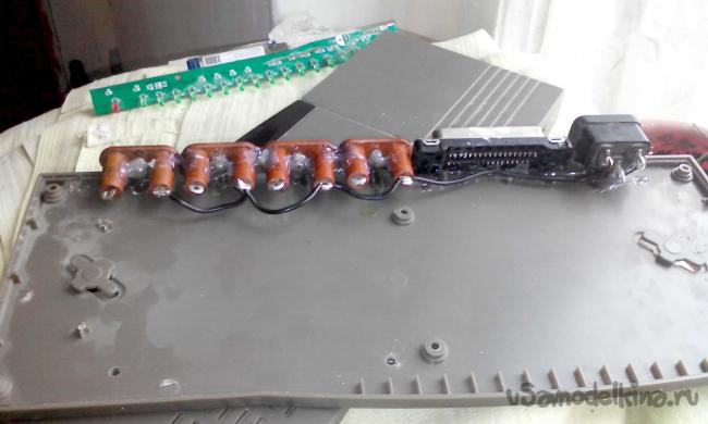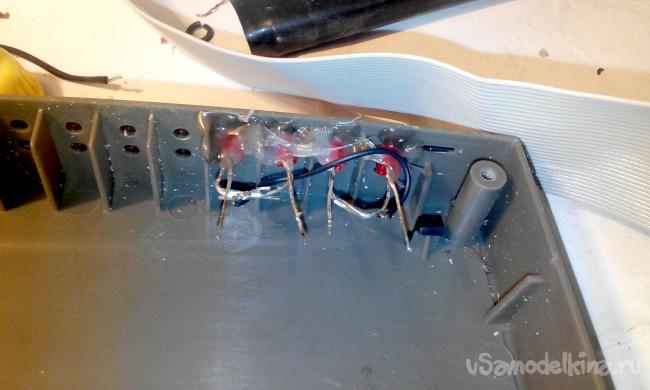После того как провода от LPTпорта припаяны, нужно припаять еще 5 проводов для светодиодной индикации, светодиоды я установил на места светодиодов которые показывали наличия подключенных к свитчу проводов.