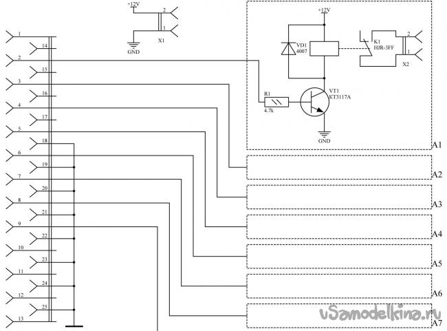 Просмотрев схему которая состоит из резистора, транзистора, реле и диода, решил для себя что с лёгкостью справлюсь с этой задачей, и немного её модифицирую, а именно добавив светодиоды для удобства и индикации.