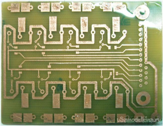 Печатаем плату на лазерном принтере и переводим на текстолит, далее ее необходимо вытравить и пролудить.