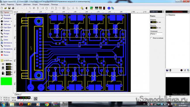 Начинать будем из разработки платы и травления ее. Мне посчастливилось найти готовую печатную плату в формате «.lay», для ее открытия я использовал программу «Sprint-layout_6.0».