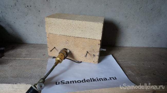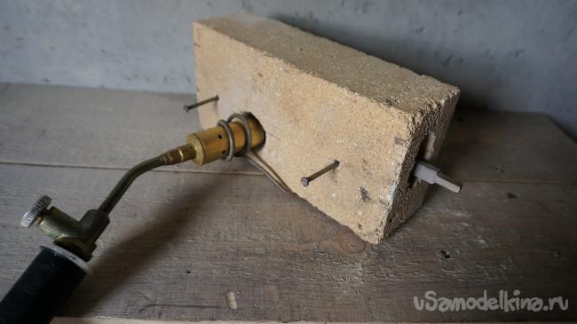 Устанавливаем кирпич, с устроенной в нем камерой нагрева, на держатель горелки. Вставляем гвозди, используемые в качестве держателей для заготовки. Гвозди должны быть тоньше диаметра отверстий и входить в них свободно, чтобы при расширении от нагрева, они не раскололи кирпич. Устанавливаем на них заготовку ножа на ребро, так чтобы она не касалась стенок камеры. Обкладываем основной кирпич с камерой нагрева с тыльной стороны и сверху двумя шамотными кирпичами. Вставляем горелку в держатель. Горн готов для нагрева заготовки ножа до необходимой температуры закалки.