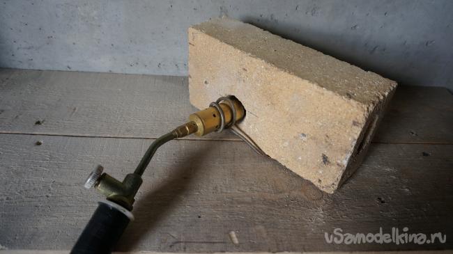 Из мягкой стальной проволоки изготавливаем простейшее, показанное на фотографии, устройство для фиксации газовой горелки в требуемом положении. Ножки держателя подводим под кирпич.