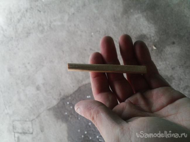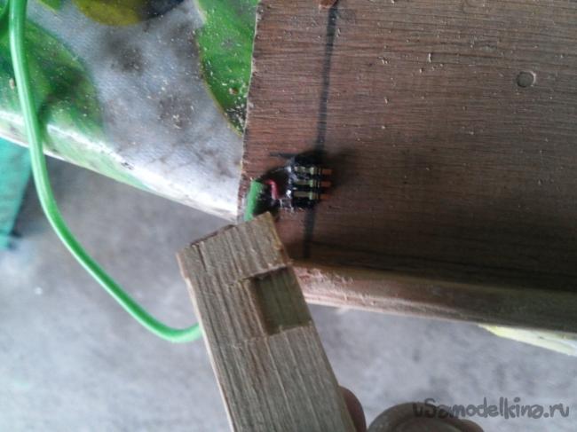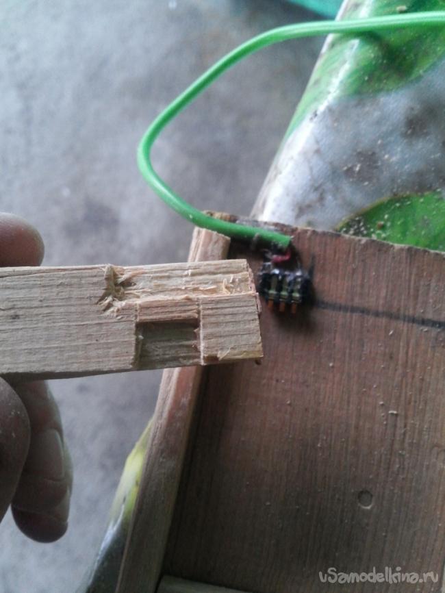 Нижняя часть будет короче, а верхняя шире, как я уже говорил 1 см шириной. На стороне 1 см шириной нужно выпилить лобзиком углубление под контакты, как на фото.