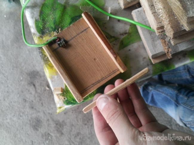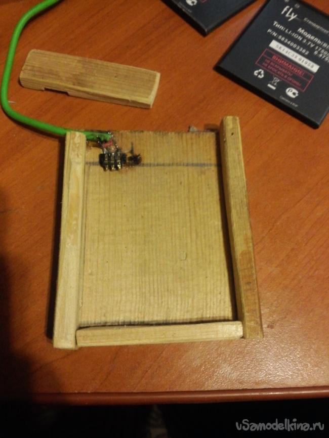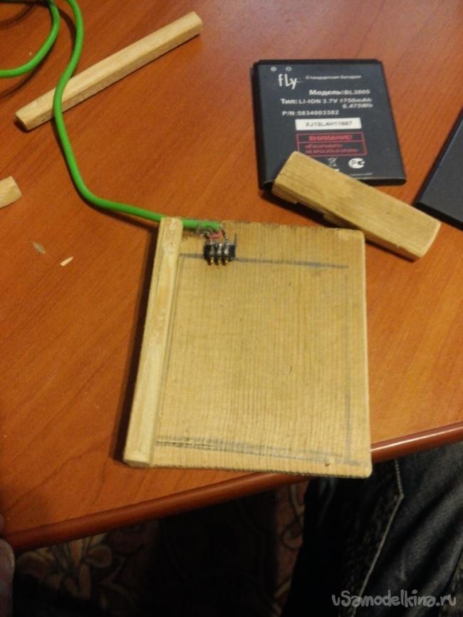 Из кусочка дощечки я выпилил квадрат, примерно на 5 мм больше с трех сторон чем аккумулятор, а с чертовой стороны оставил 1 см для лучшего удобства и прочности конструкции. Теперь необходимо установить на место контакты для присоединения аккумулятора, их я заимствовал из старого телефона, который давно сломался.