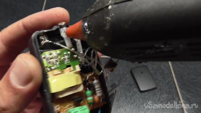 Далее разбираем корпус зарядного устройства от мобильного телефона и проделываем то же самое.