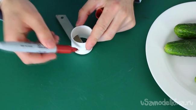 Первым делом отступая от края трубы приблизительно на 10-20 мм, проделываем надрез при помощи ножовки до середины. По словам автора угол надреза следует выбирать индивидуально, поскольку от этого угла зависит толщина надрезанных морковей или огурцов.
