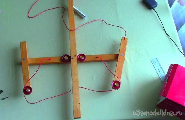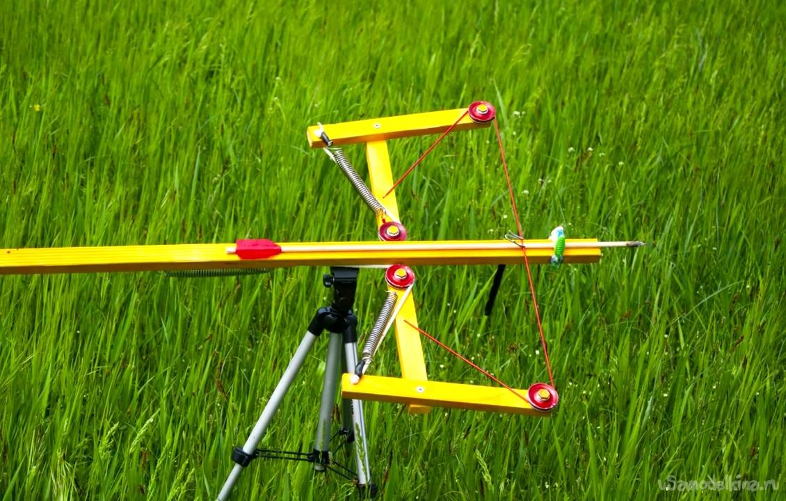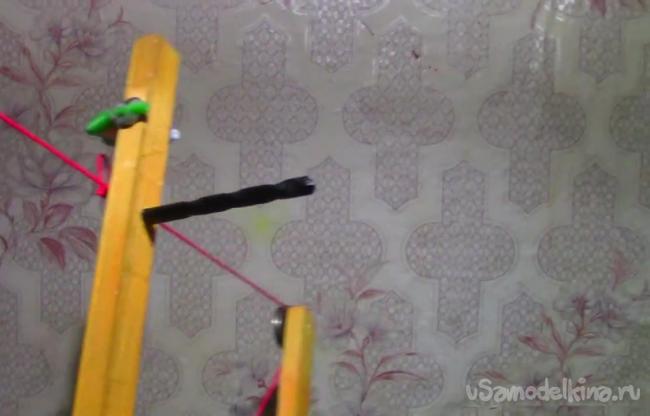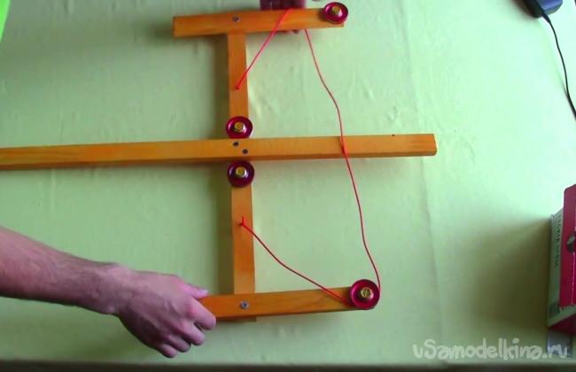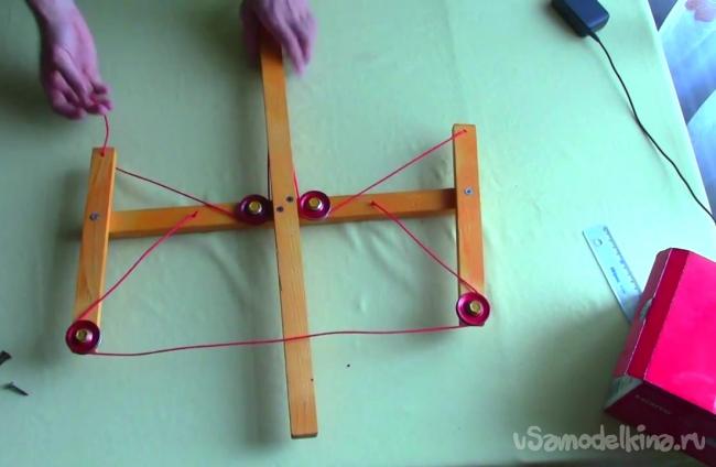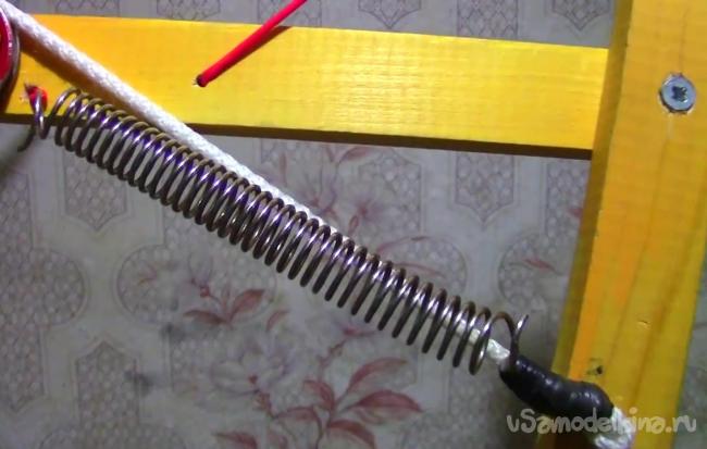 Берем еще один отрезок веревки и закрепляем его на плечах лука, продеваем через остальные ролики и через пружину. По словам автора идеи, веревки в конструкции должны быть натянуты так, чтобы до натягивания тетивы пружина была уже в натянутом состоянии.
