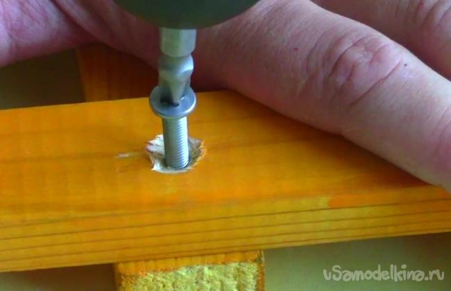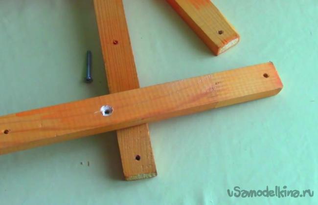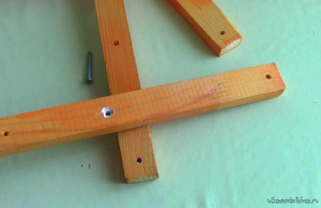 На краях средней планки закрепим короткие, получив плечи лука. Делать это можно при помощи болта, но тут следует учесть, что отверстие должно быть просверлено так, чтобы болт входил в него туго по резьбе.