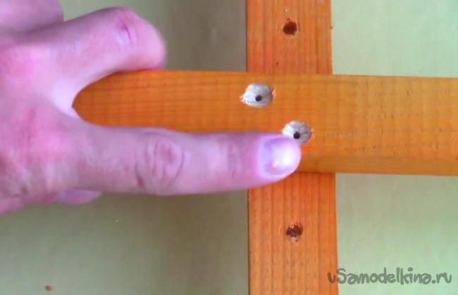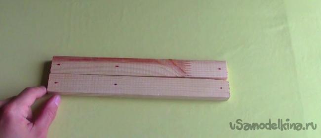 Следующим шагом берем две короткие заготовки и в каждой из них проделываем по 3 отверстия, отступая по 13 мм от краев, и от одного края по 11 см.