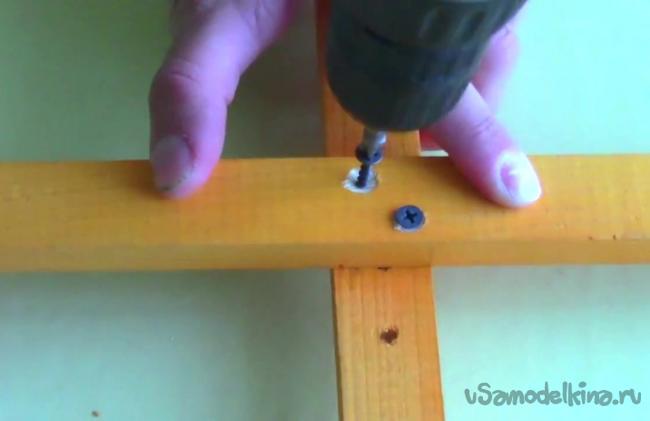 Берем среднюю по длине планку и крепим к ней длинную на отметке 28 см от края. Делать это можно при помощи клея и пары саморезов.