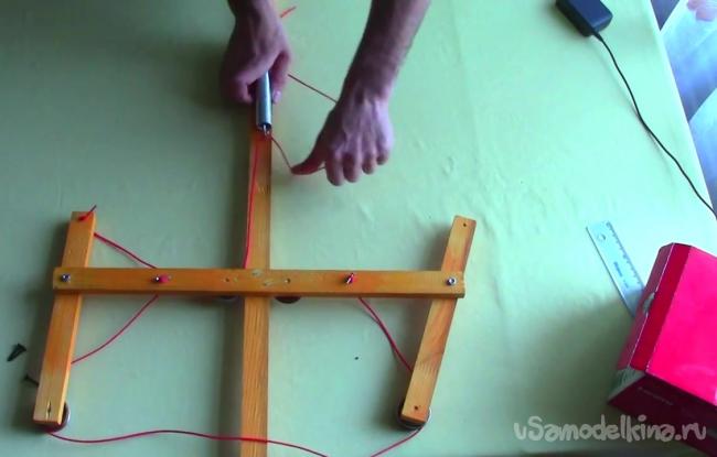 Теперь можно приступить к установке тетивы. Для этого нужно проделать еще пару отверстий на средней планке, чтобы предварительно зафиксировать там веревку. После этого продеваем ее через ролики на плечах лука.