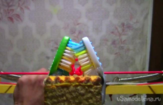 Подставку для стрелы можно сделать из двух зубных щеток. Подобная конструкция позволит стреле беспрепятственно вылетать из лука.