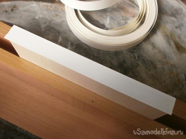 Первым делом детали для будущей цветочной полки нужно обклеить кромкой и срезать её излишки. Так что утюг, нож и брусок с наждачной бумагой вам в помощь.