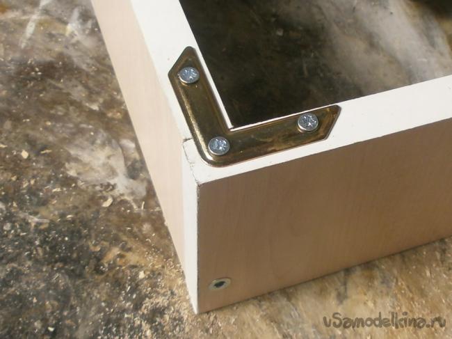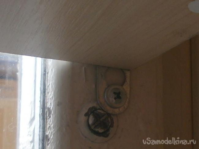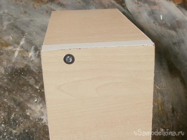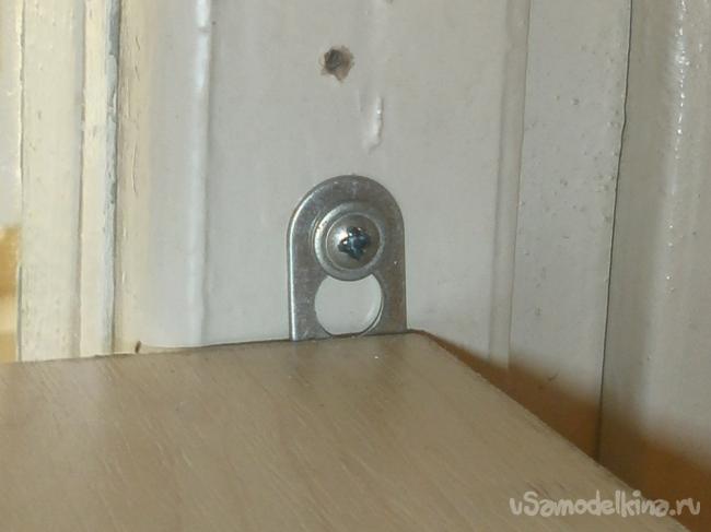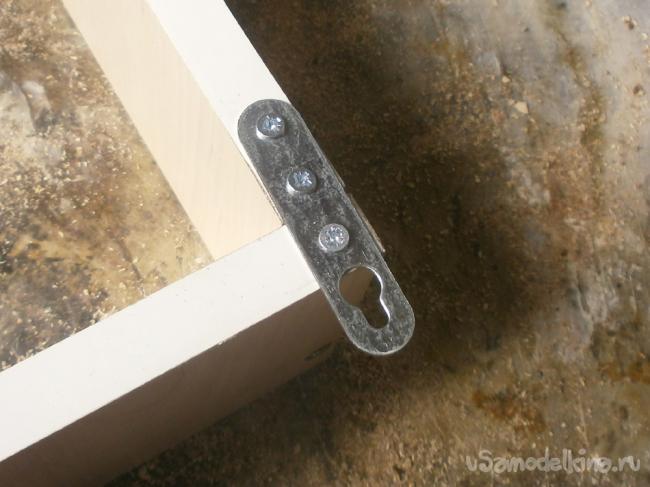 Последний фрагмент ДСП прикручиваем снова конфирматом, а вместо уголка закрепляем мебельный навес. Такой же навес прикрепляем и с обратной стороны.
