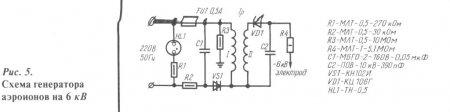Еще проще в изготовлении генератор отрицательных аэроионов, схема которого показана на рис. 5. Сборка его аналогична генератору, приведенному на рис. 3, с той лишь разницей, что число витков во вторичной обмотке трансформатора при самостоятельном его изготовлении составляет 2000 витков. Концентрация ионов данного генератора 300 000 ионов/см3.