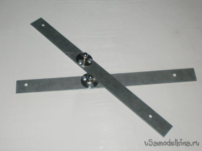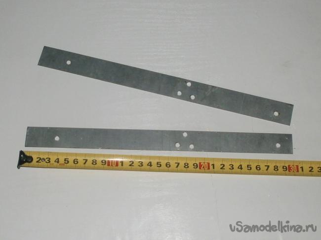 Кроме этого, понадобятся две полоски металла, толщиной 2,5 и более миллиметра (тоньше просто погнутся), и размерами 25 на 300 мм. Вот и всё, начинаем «творить».