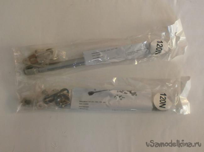 В комплекте с самим газовым лифтом, помимо шурупов (они нам не понадобятся), есть три вида шарниров: