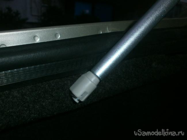 Вариант первый я отверг сразу, так как была высока вероятность разбить заднее стекло машины, пружины были хороши только первые дни, затем растянулись и вообще перестали справляться с весом (укорачивание их тоже не помогло, эффект тот же самый). Поэтому оставались только газовые упоры от «Калины», «Самары» или «Нивы». Но видеоролики, которое попадалось мне в сети, выявили одну и ту же особенность: крышка багажника с двумя упорами просто таки «выстреливала», а с одним её попросту перекашивало.