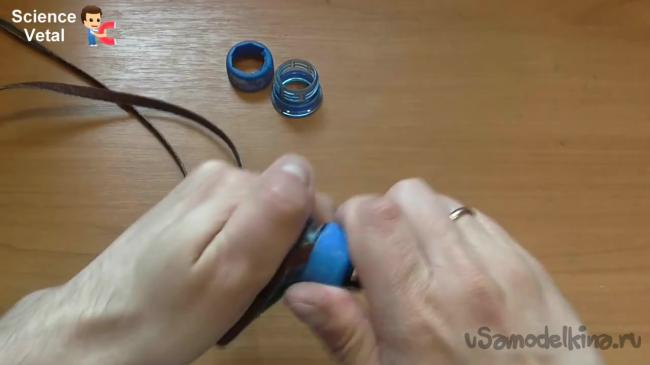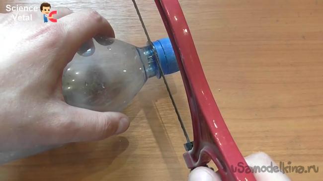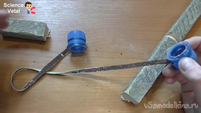 Осталось собрать конструкцию воедино. Каждый из краев необходимо просунуть между горлышком бутылки и крышкой. Таким образом, можно получить неплохую пилу, которая не будет занимать места в сумке.