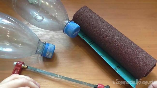 Первым делом необходимо отрезать горлышко от первой бутылки при помощи ножовки.
