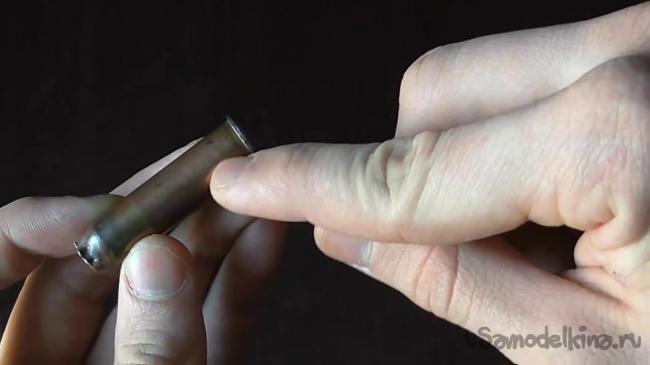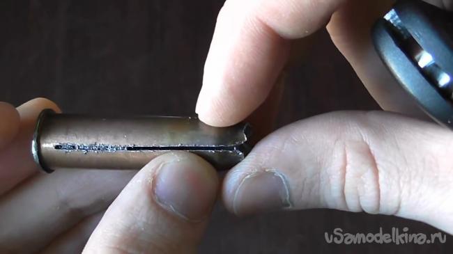 Первым делом необходимо сделать пропил вдоль гильзы с двух сторон.