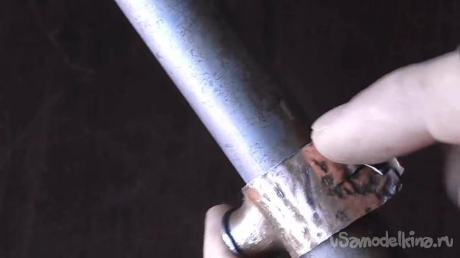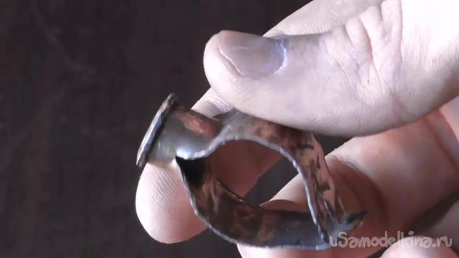 На этом этапе можно приступить к формированию перстня на металлической трубе. Для этого надеваем заготовку на трубу и обстукиваем со всех сторон, чтобы гильза закруглилась.
