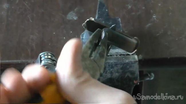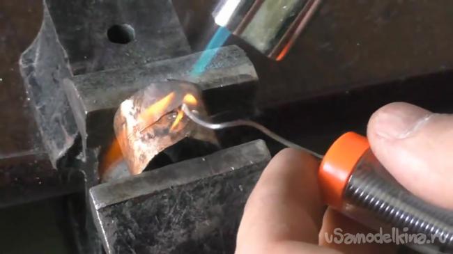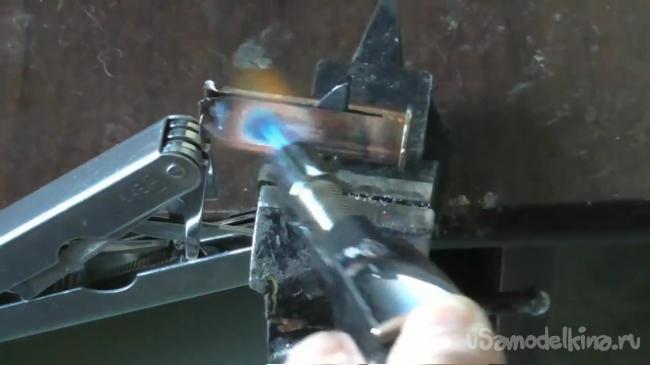 Теперь необходимо отгибать пропил, сделанный на предыдущем шаге. Для этого можно нагреть гильзу газовой горелкой и начать постепенно отгибать при помощи плоскогубцев.