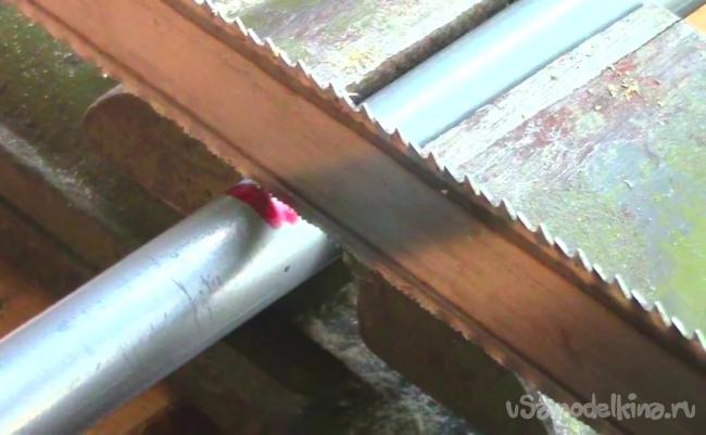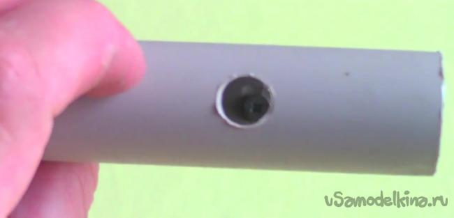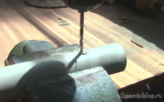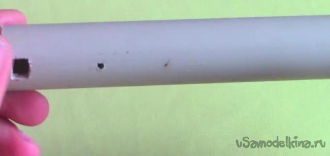 Далее проделываем на полипропиленовой трубе два отверстия под болт и крючок.