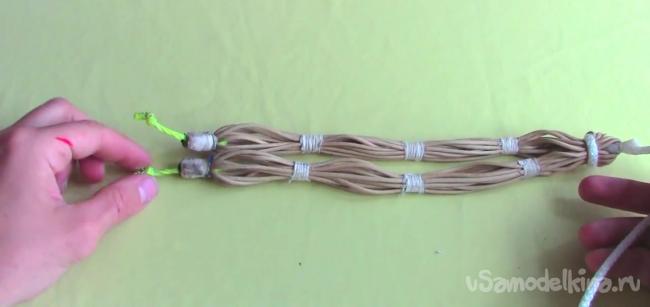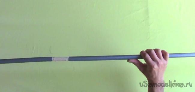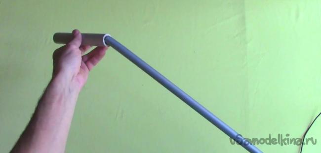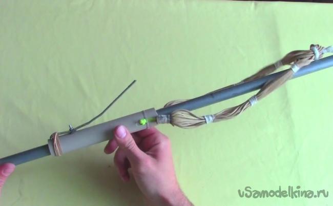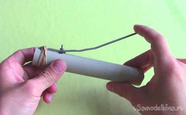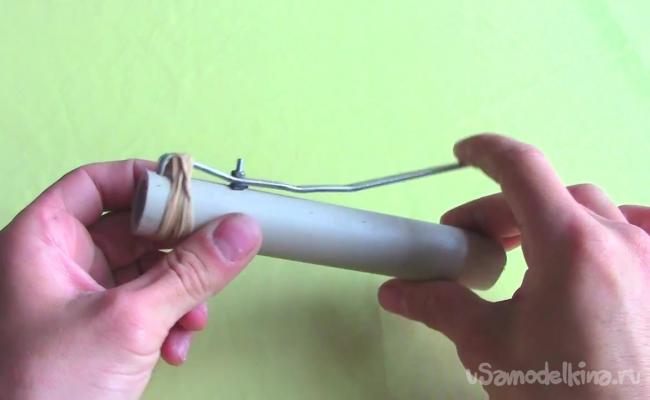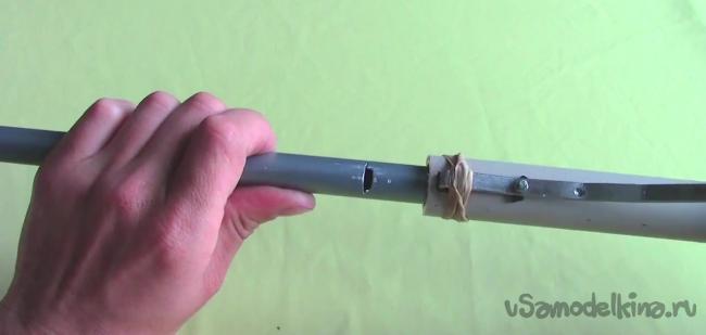 Далее берем мощную резину и фиксируем один конец на трубке, а второй – на трубке ПВХ.