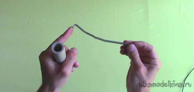 Край старого шампура необходимо загнуть буквой «Г». Также примерно по центру необходимо проделать отверстие, чтобы получить заготовку, примерно как у автора.