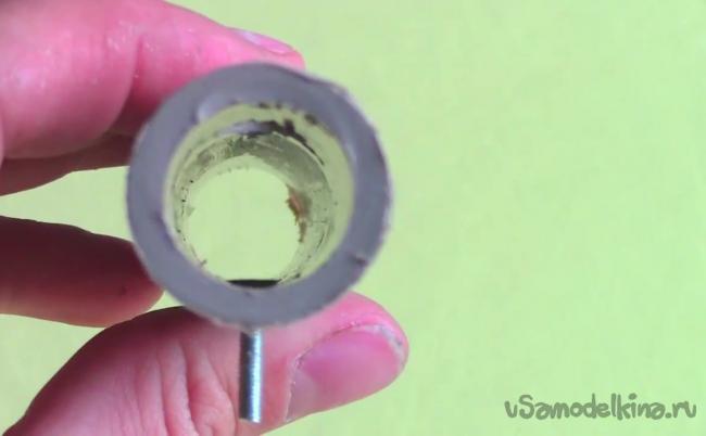 Теперь необходимо соединить конечных с трубкой. Для этого берем круглый кусок дерева и приклеиваем к нему наконечник, используя эпоксидную смолу.