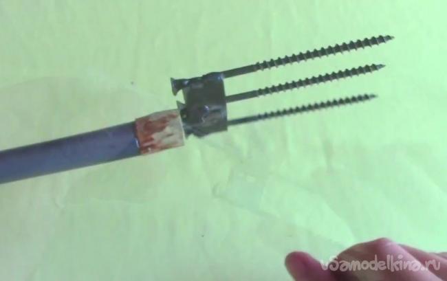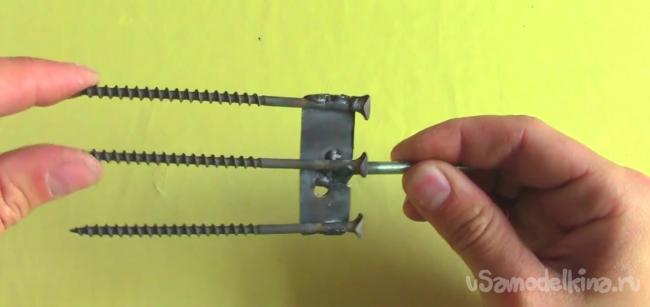 Перейдем к изготовлению гарпуна. Для этого берем стальную пластину и привариваем на ней три самореза, а также болт посередине.