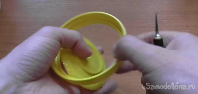 В самом начале нужно вырезать дно емкости, а также проделать большое круглое отверстие на крышке.