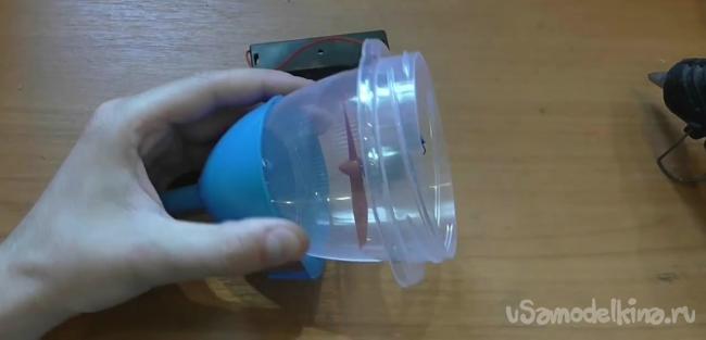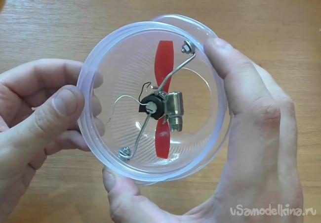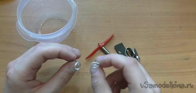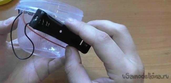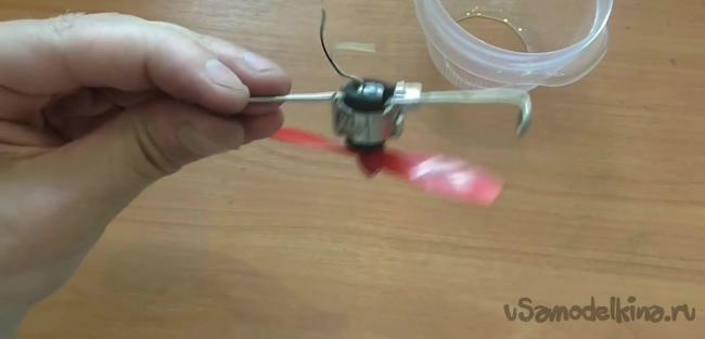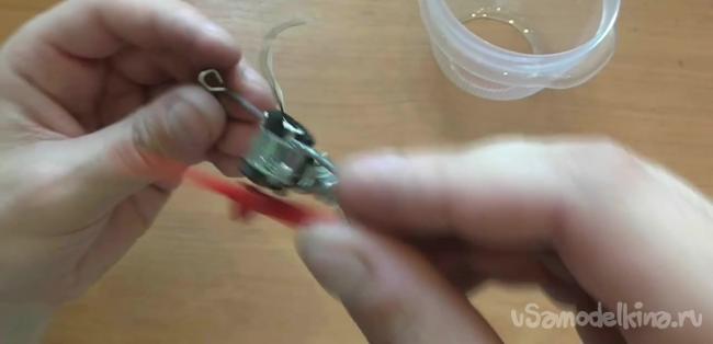 Проволоки также понадобятся для того, чтобы зафиксировать двигатель в емкости. Для этого кончики проволоки сворачиваем в кольца, проделываем на стенках емкости отверстия под винты и таким образом фиксируем двигатель.