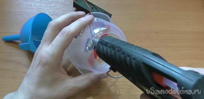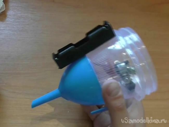 Приклеиваем лейку на дне емкости, где также проделали отверстие в самом начале работы. Приклеить можно клеевым пистолетом.
