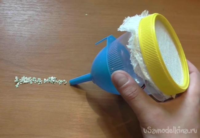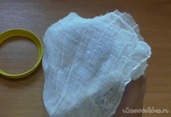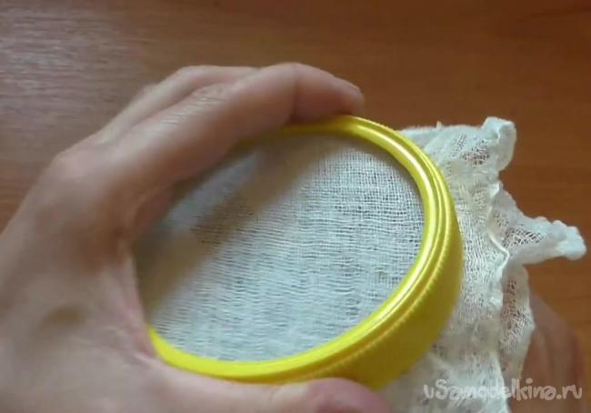 Наконец устанавливаем марлю, которая будет выполнять роль фильтра. Ее кладем на горлышко и фиксируем крышкой, на которой также вырезали отверстие.