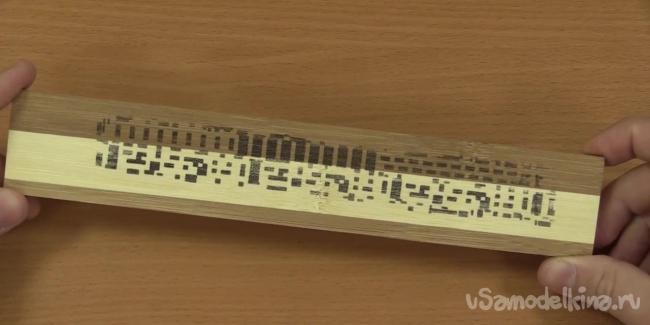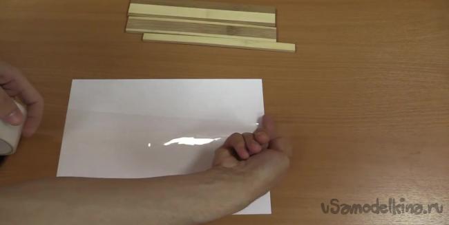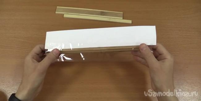 Далее берем самую широкую дощечку и фиксируем распечатку с помощью скотча. не допуская смешений.