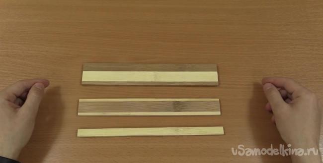 Первым делом при помощи электрического лобзика нужно выпилить три дощечки из разделочной доски. Размеры полученных дощечек должны быть следующими: 250х45 мм, 250х30 мм и 250х13 мм.