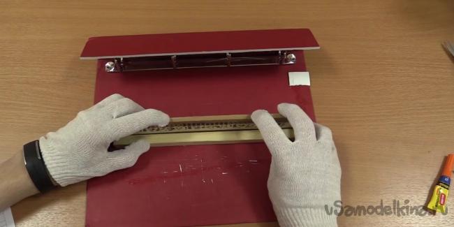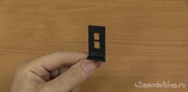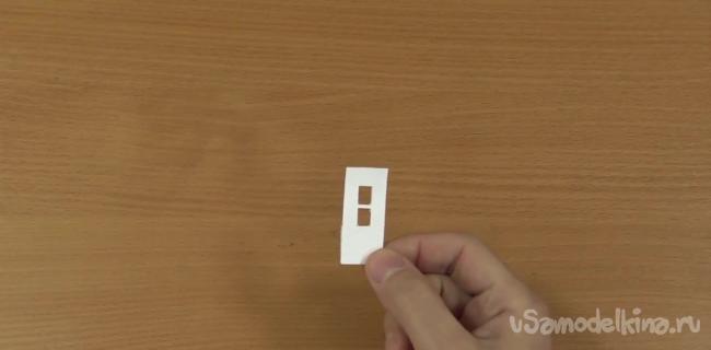 Можно приступить к изготовлению ползунка. Делать это проще из старого бокса от CD. Длина ползунка должна быть равна 45 мм, а ширина – 20. Также необходимо сделать два вертикальных отверстия размером 8х6 мм и расстоянием между ними в 2 мм.
