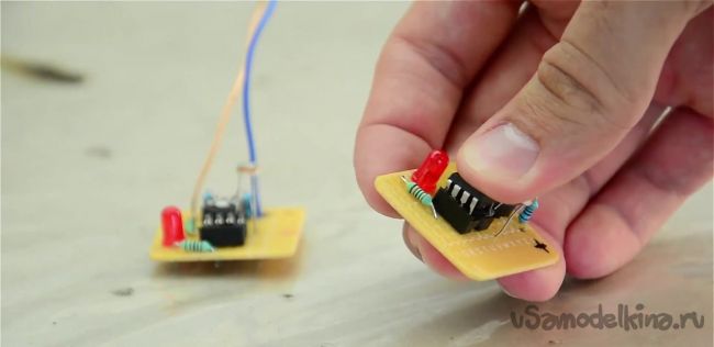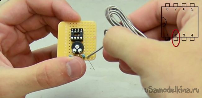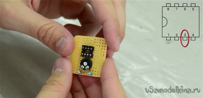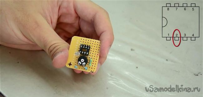 Когда сборка закончена, можно вставить LM741, на котором, кстати, есть обозначающая точка, которой нужно вставить в сторону плюса.