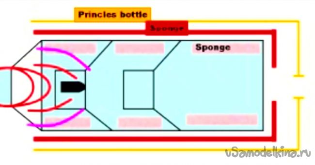 Вставляем одно горлышко в другое. Тут очень важно, чтобы одно горлышко было в достаточном расстоянии от второго. Если будет слишком близко, то газы не успеют задержаться в камере, что приведет к потере желаемого эффекта. Также необходимо обратить внимание на то, чтобы поролон достаточно плотно прилегал к стенкам бутылки.