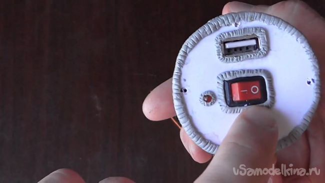 Схему закрепим на круглой заготовке из пластика. Для этого отмечаем места, которые нужно вырезать, то есть места под USB разъем и выключатель, а также отверстие под светодиод.