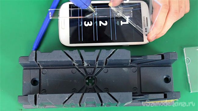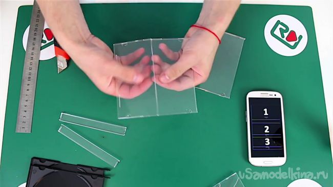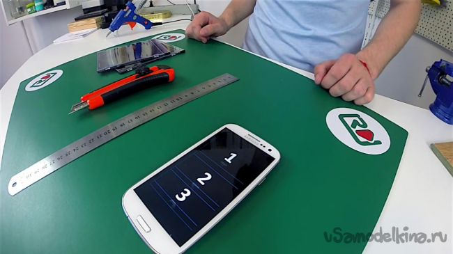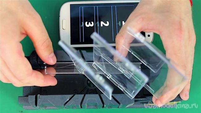 После запуска видеоролика на экране смартфона появятся цифры и линии. Полученные в ходе подготовительной работы заготовки нужно приложить к линиям под углом 45 градусов.