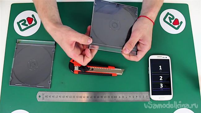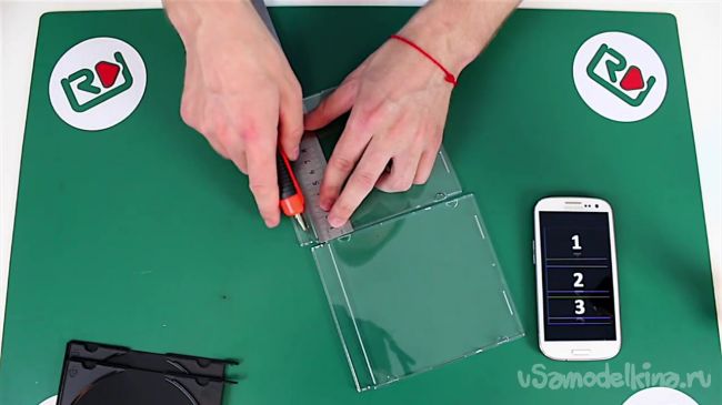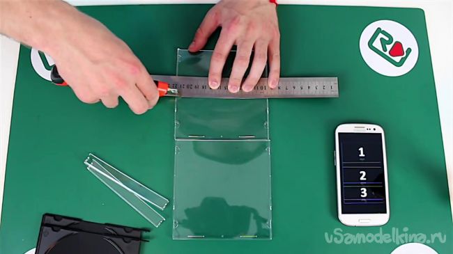 Далее необходимо отрезать две тонкие полоски, расположенные у краев крышек от коробок из-под дисков. Для этого берем линейку, кладем ее у линии полосок и канцелярским ножом делаем неглубокие надрезы. После этого аккуратно отламываем эти части.