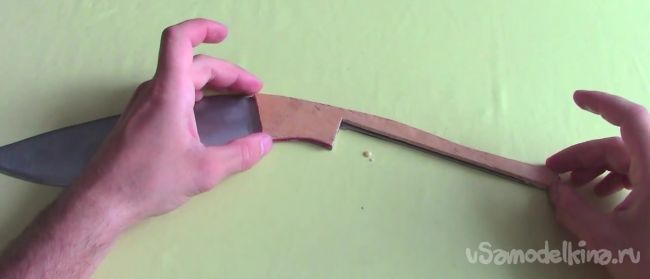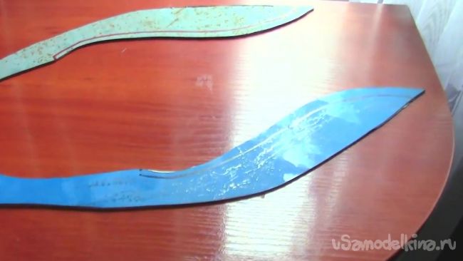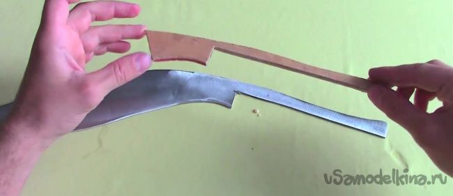 Далее берем фанеру толщиной 3 мм и вырезаем из нее заготовку, похожую на ту, которая на рисунке ниже, то есть повторяющую форму рукояти.