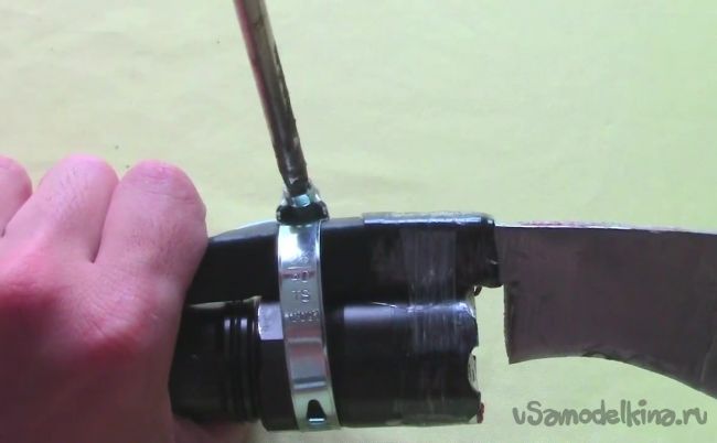 Закрепляем электрошокер на рукояти мачете с помощью металлических хомутов.