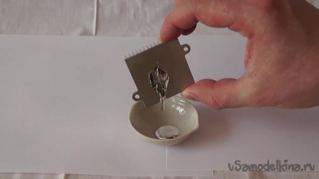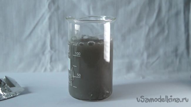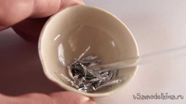Берем кусок фольги и складываем ее несколько раз. Далее нарезаем полученный кусок на небольшие кусочки. Засыпаем эти кусочки в емкости и капаем на них несколько капель жидкого галлия.