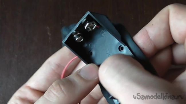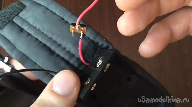 Берем два куска провода и подключаем при помощи них переключатели к коробочкам для аккумуляторных батареек. Сами переключатели можно приклеить на боковой части коробочек.